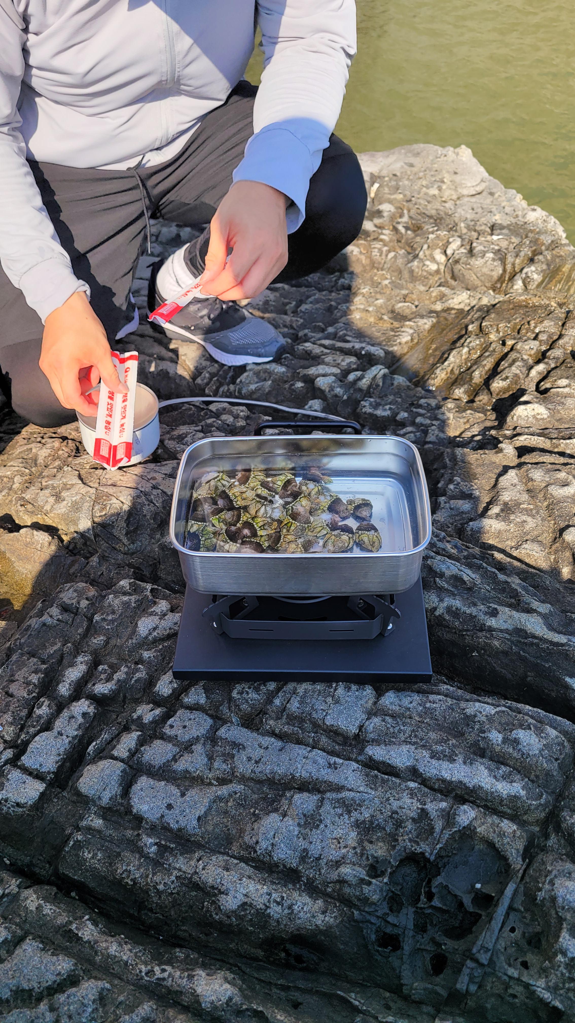 동생은 라면 끓일 준비를 하기 위해서 바위에 붙은 거북손을 잡습니다.
