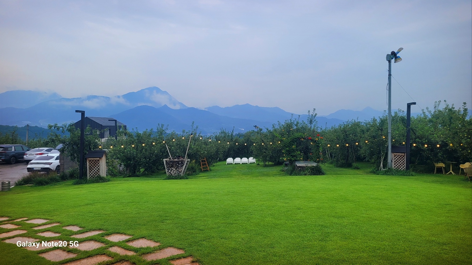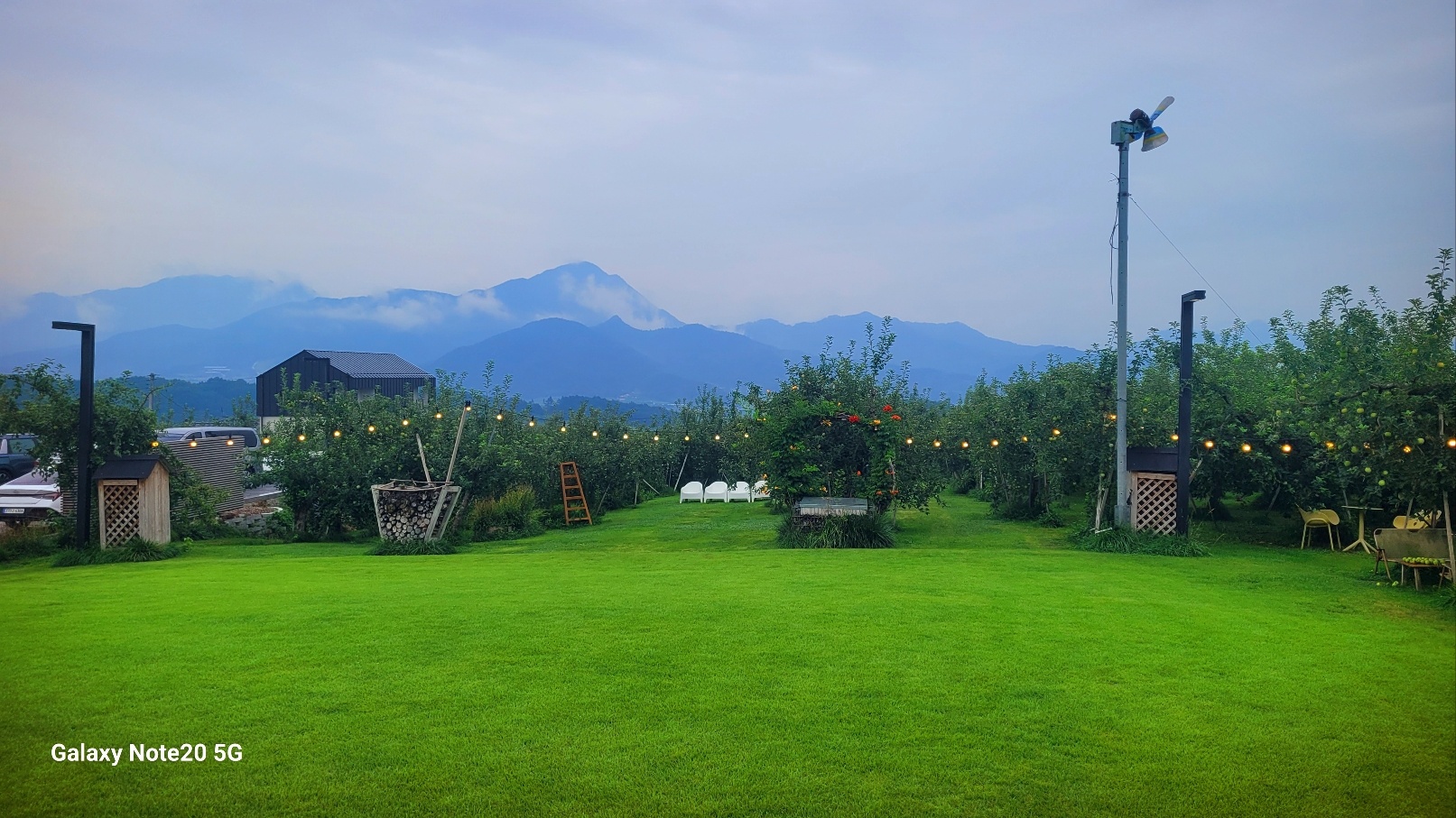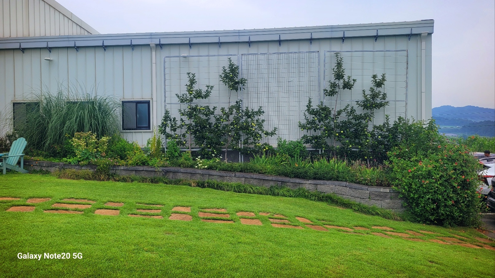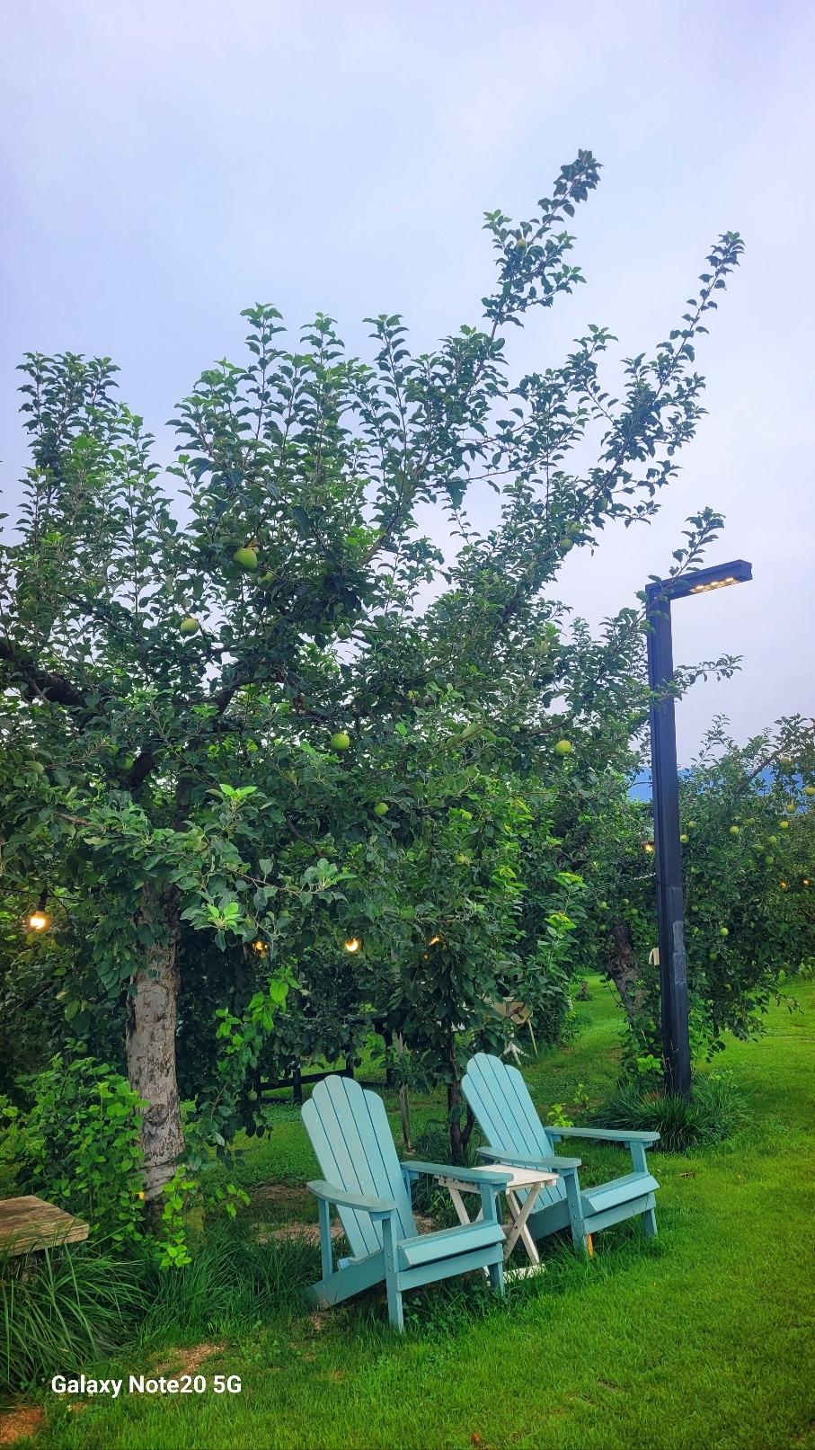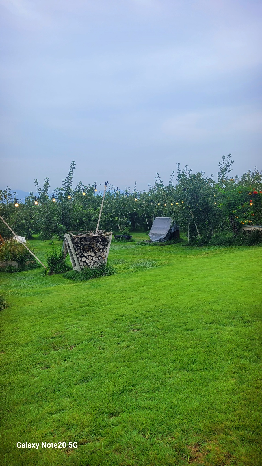 실제로 저기 보이는 나무들이 다 사과나무들이예요. 가까이 가보면 사과가 주렁주렁 열려 있습니다.